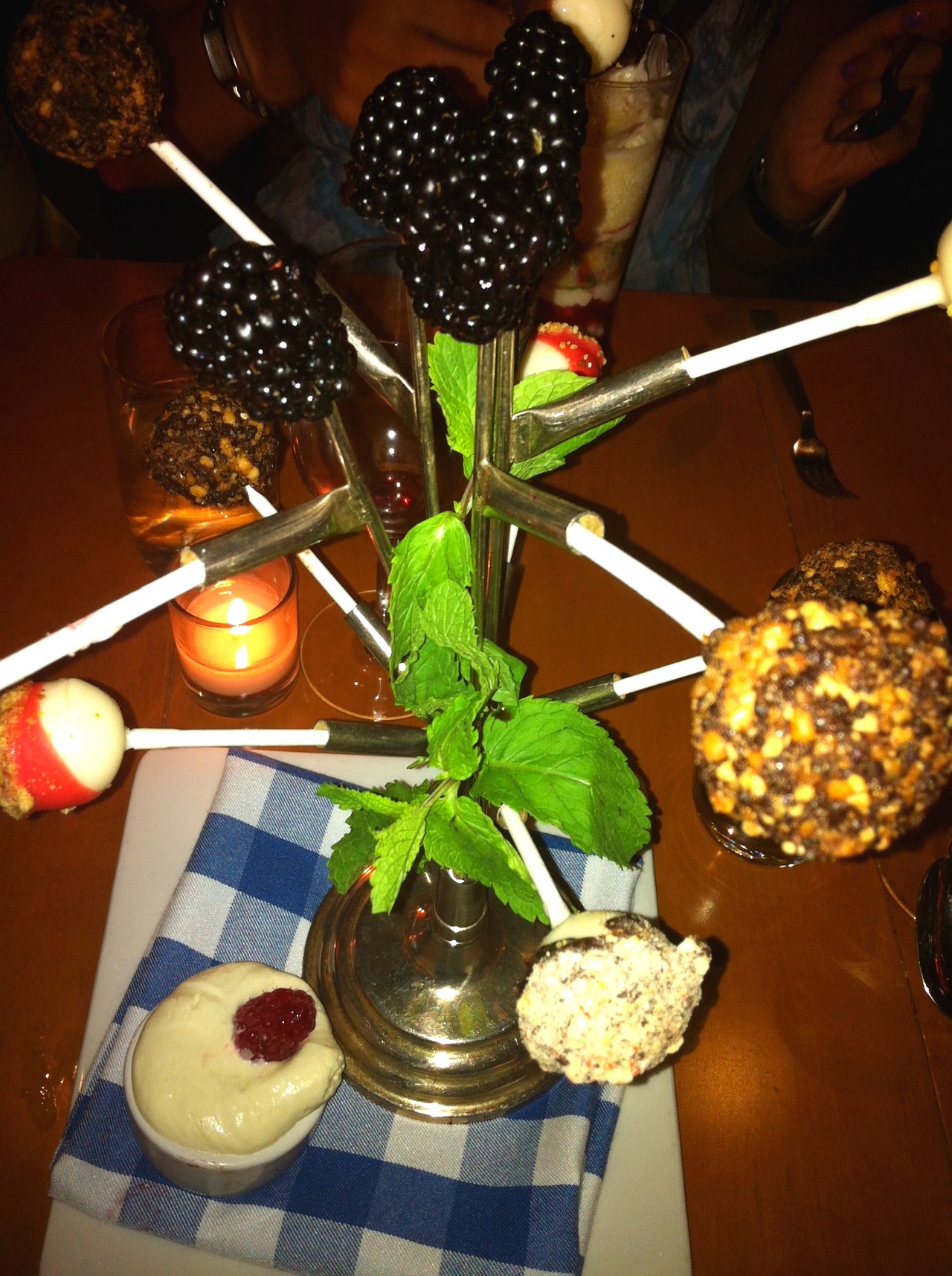 David Burke Kitchen (the original cheesecake lollipop tree for two, passion fruit whipped cream)