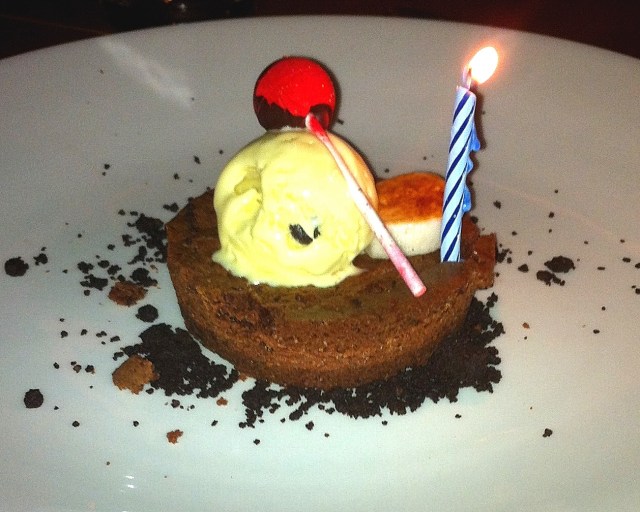 Dessert comes, and I’m petrified they forgot the candle. They didn’t! Thank G-d! Unfortunately the mint brownie my mom ordered pretty much sucks.