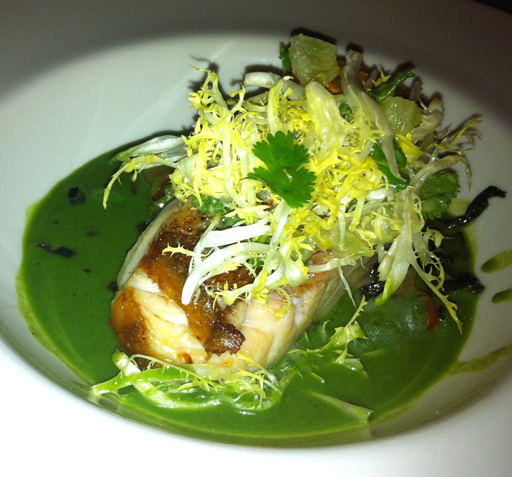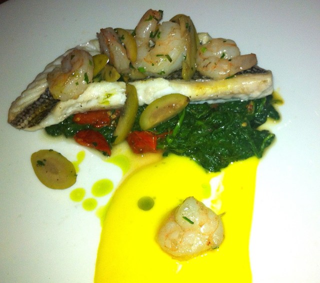 David Burke Kitchen (black sea bass: baby shrimp, spinach, tomato, olive, yellow pepper)