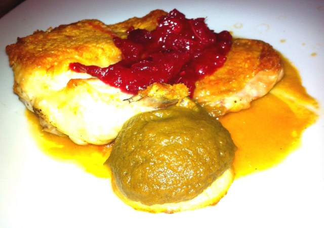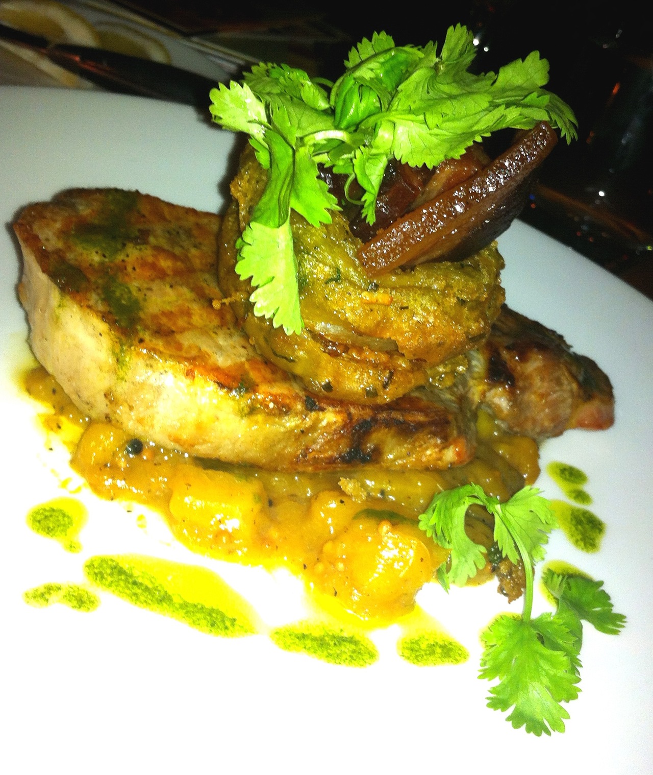 David Burke Kitchen (pork chop: cumin bacon, mango chutney, parsley onion rings)
