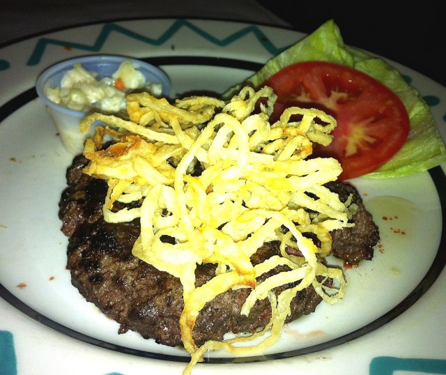 My sister got a salad with a burger patty on top so I don’t know, but one can convince themselves that anything is healthy when there’s lettuce. She ordered the dressing on the side, but the dressing was Thousand Island dressing, and she dunked each bite into the dressing, and ordered more. She didn’t say she was on a diet, nor does she want to be.
