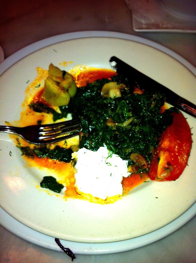 I actually ordered spinach again as my main too, but this time it came hot and with mushrooms (relax, Popeye). Mushrooms and spinach are a super filling option if you don’t want meat (I do not observe Lent but some peeps do. I am one of the chosen people, but it is also a vegetarian option too. I am just trying to stay current).