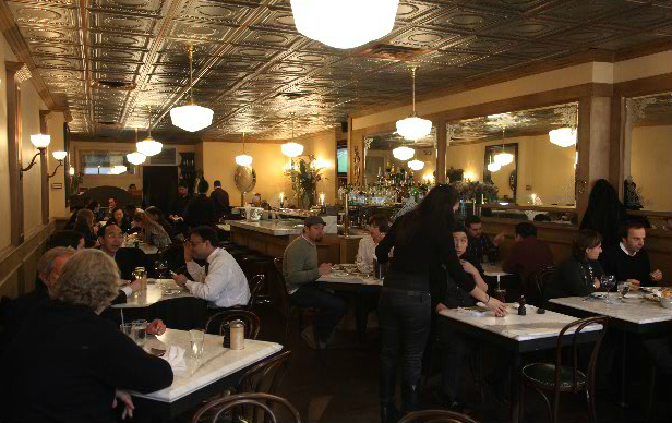 She makes a face, and I know this isn’t working. He offers us another table, but I see that it’s in the corner by the servers, so we’re going to get a permanent breeze by the wait staff swooshing by.