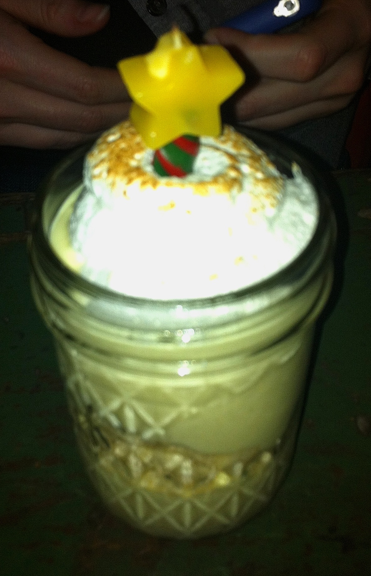 Dessert!! Banana pudding with salted Caramel. I am not the biggest of banana cream pie, and that’s pretty much what it was, but in a jar. However our awesome waiter, Dan Brown, brought out one with a candle.
