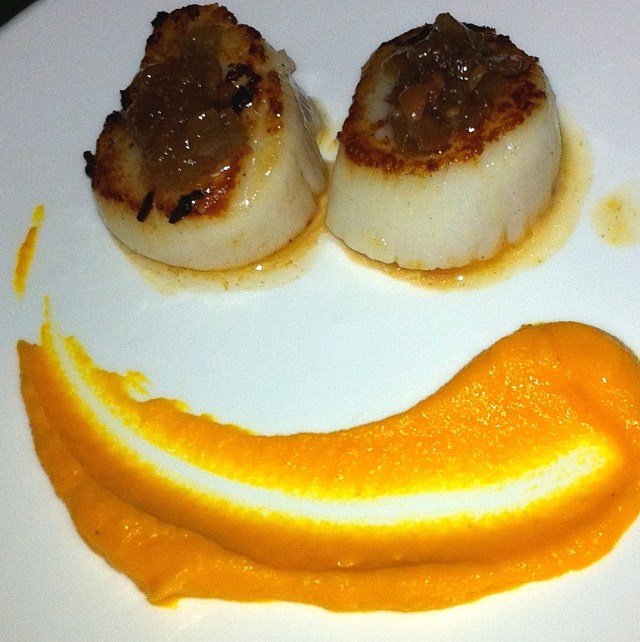 City Grit (seared scallop with harissa carrot puree, bacon marmalade)
