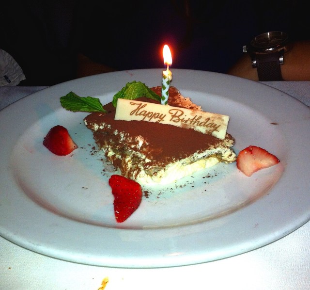 Both desserts arrive, and of course the tiramisu comes with a candle, and we awkwardly sing “happy birthday” to my sister.